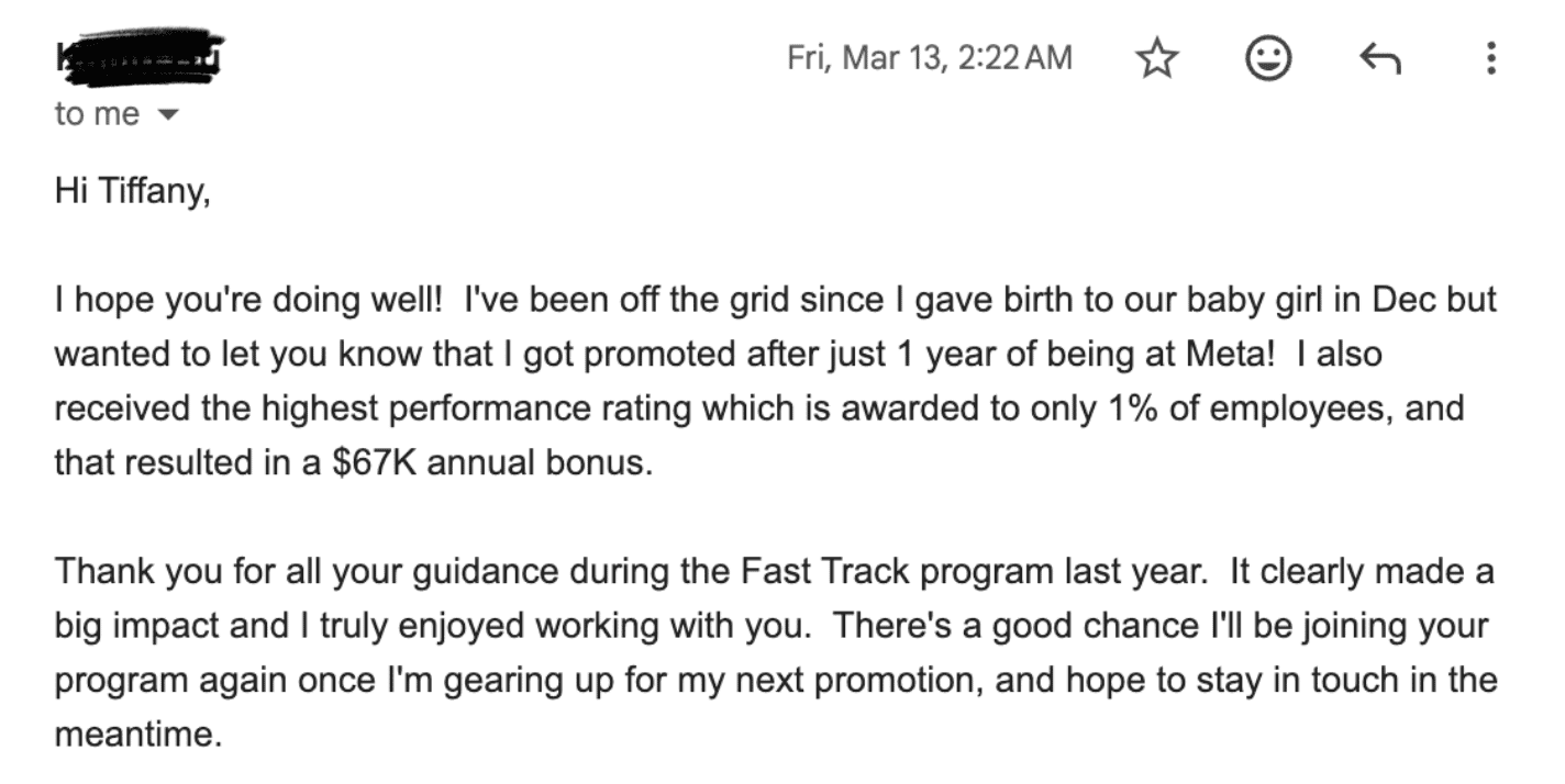The result? She secured her promotion in her first year and landed the highest performance rating, awarded to only 1% of employees. She headed into maternity leave with a $67K annual bonus and the peace of mind that she didn't have to 'wait her turn' to be recognized as a leader.