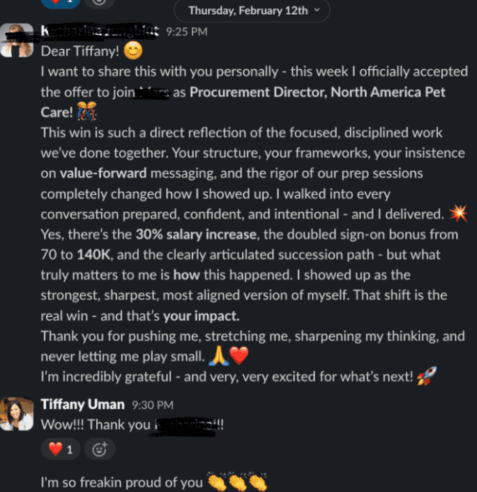 Knowing these helped my client make a massive career move after recognizing her current company was stalling her promotion. I prepared her personalized roadmap to close her growth gaps fast and, with the 1:1 coaching support with me and my team, last week she secured her Director promotion, 30% raise, and negotiated her sign-on bonus from $70K to $140K. 🤯
