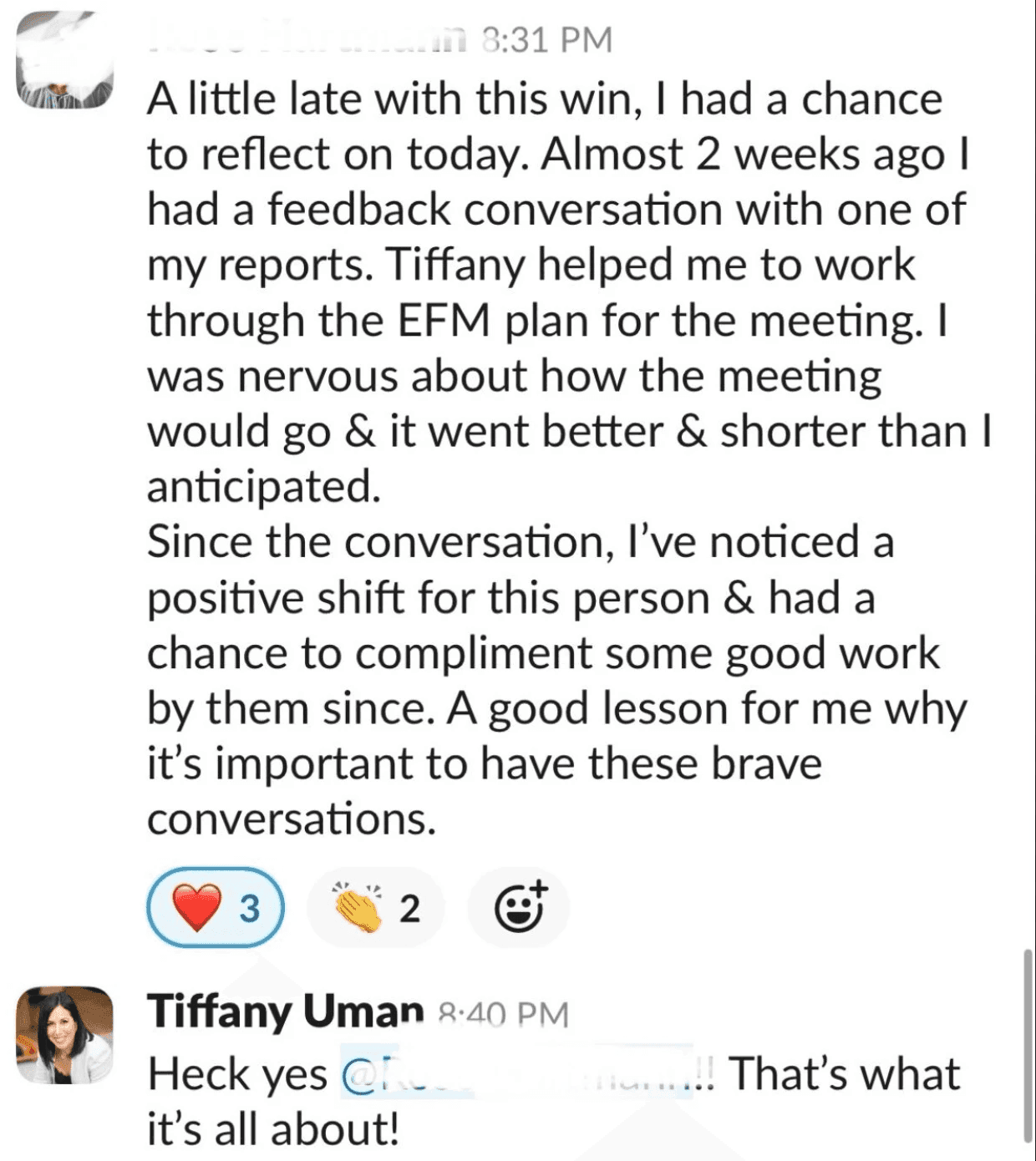 This is exactly what our client did with her team for a hard conversation she was initially hesitant about. In leading with empathy, it helped her employee to be much more receptive to the feedback shared. Since that conversation, she's already noticed clear improvements in her employee's behaviour.