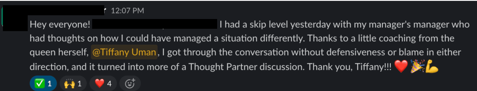 This is the strategy I coached one of our clients on recently when she was facing a delicate situation with her boss's boss. It helped her transform a tense conversation into a thought partner discussion.